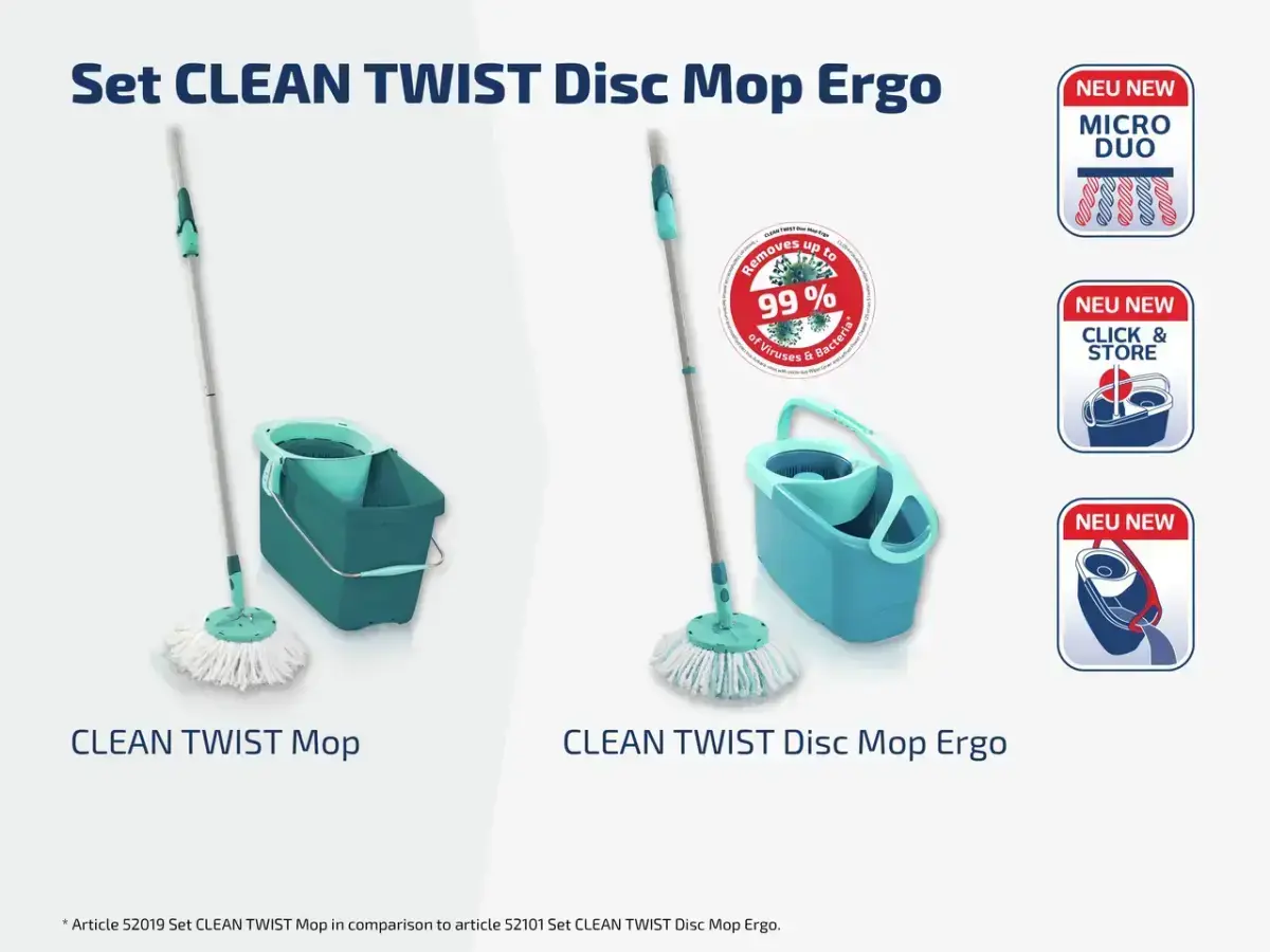 LEIFHEIT Clean Twist Disc Mop Ergo komplektā ietilpst viss nepieciešamais, lai atvieglotu grīdu tīrīšanas darbus + šim komplektam klāt grīdu mazgāšanas līdzeklis koncentrāts Power Cleaner 1L
