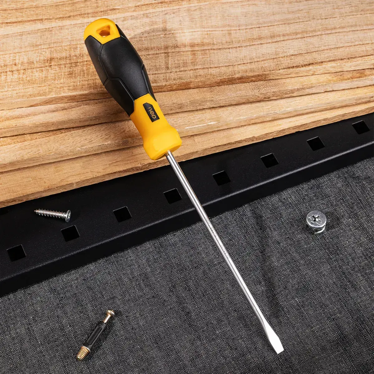 Practical and durable flathead screwdriver in black. The handle of the product is made of high quality plastic. There is a practical hole in it, which makes it possible to hang it, for example, on a tool board. Screwdriver fits perfectly in your hand and is extremely comfortable to use.