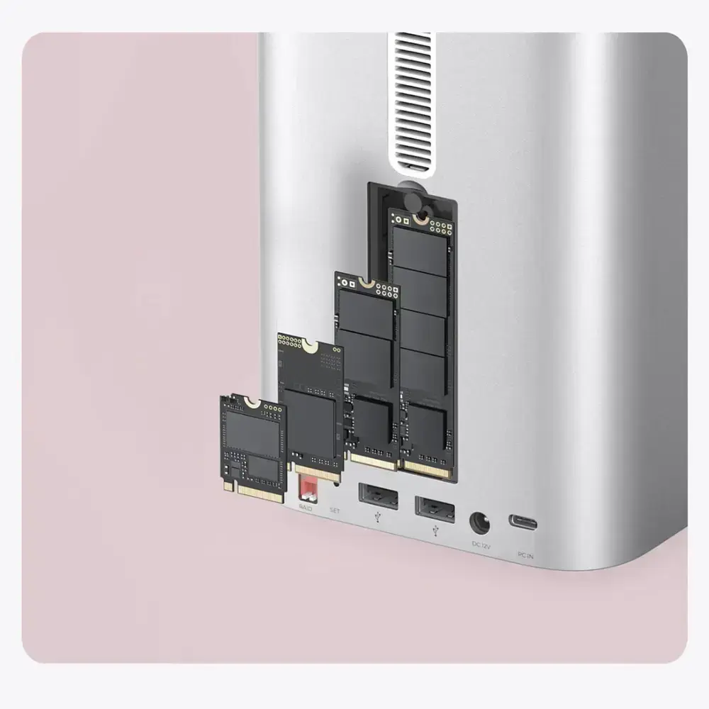 • Maximum capacity: up to 56TB (up to 8TB SSD + 2 x up to 24TB HDD)