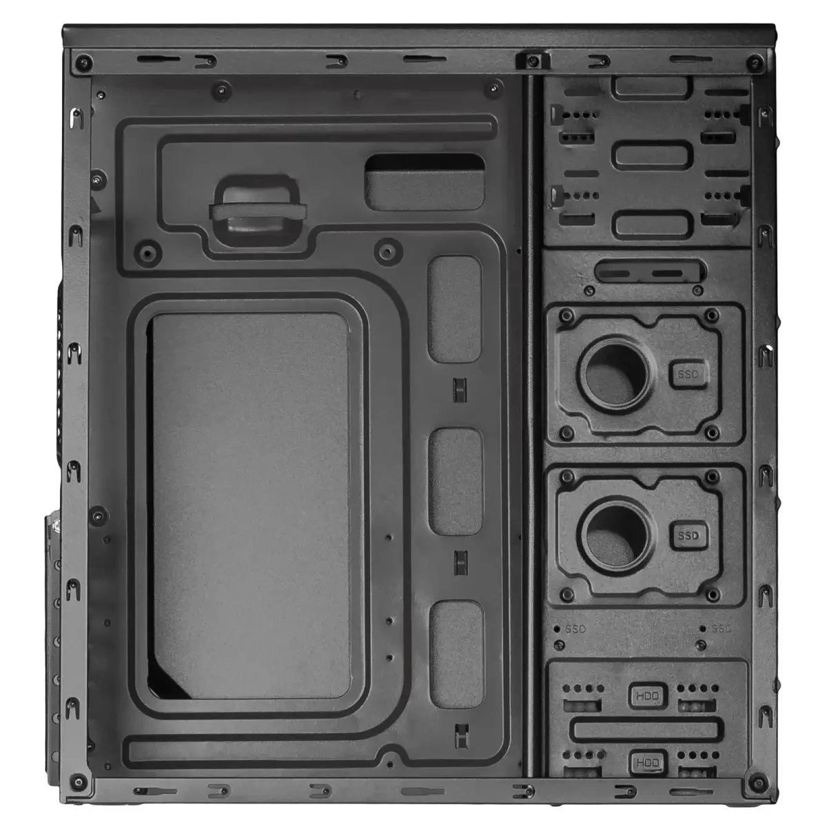 The case makes it possible to install two fans: side (12 cm) and rear (12 cm). The maximum height of CPU cooling system is 150 mm. Cooling is also favored by a front panel almost entirely made of steel mesh. This means that air circulation (with or without fans) is much better than in fully enclosed case, and this provides cooler conditions for key components, ensuring their stable operation for longer time. On the front panel there are two USB 2.0 which are great for connecting wireless mice, keyboards, external storage media or other devices. The headphone and microphone inputs are located right next to, providing fast and easy access for peripherals.
