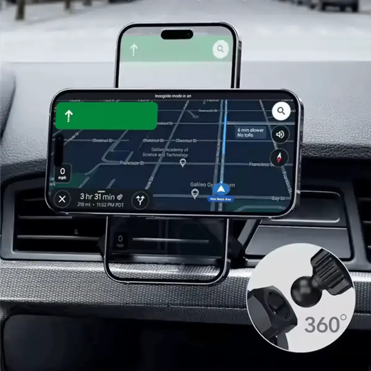• Unobstructed view – Mounts to the air vent, keeping the windshield clear.
