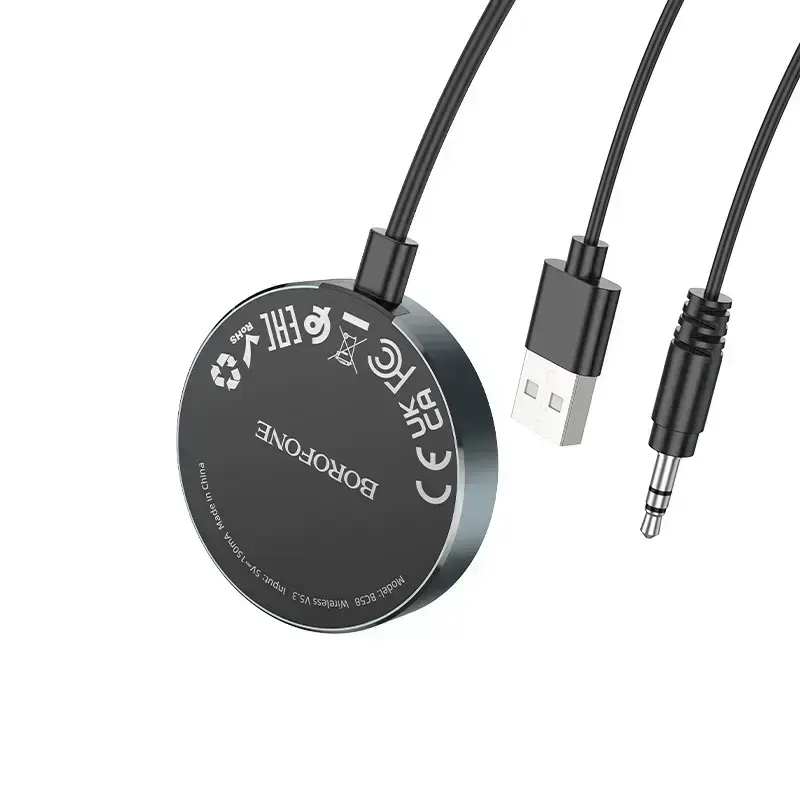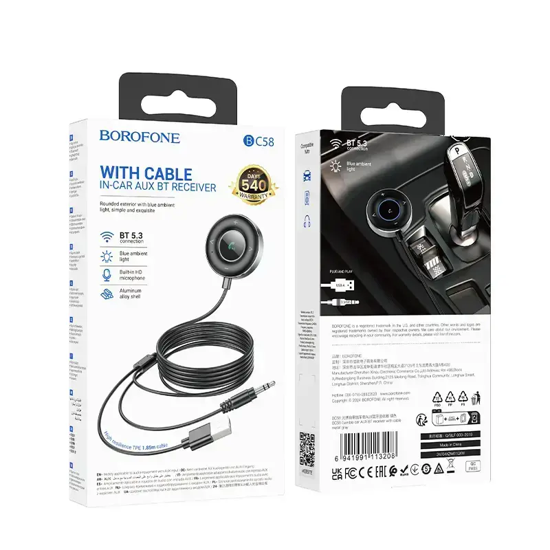 Borofone Bluetooth AUX Receiver BC58 Gamble in Gray is a convenient and modern device that turns any 3.5 mm AUX audio system into a wireless one. Perfect for use in cars, speakers, headphones, and other audio devices without built-in Bluetooth functionality.
