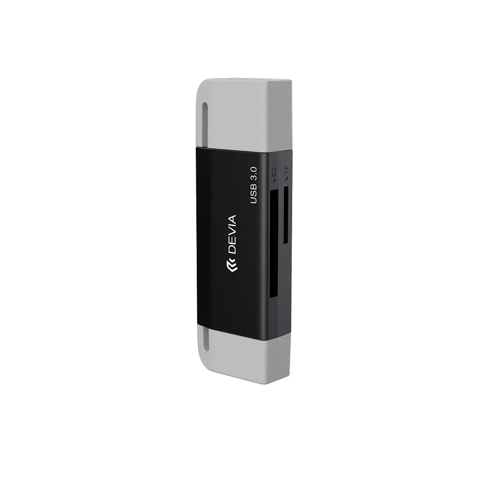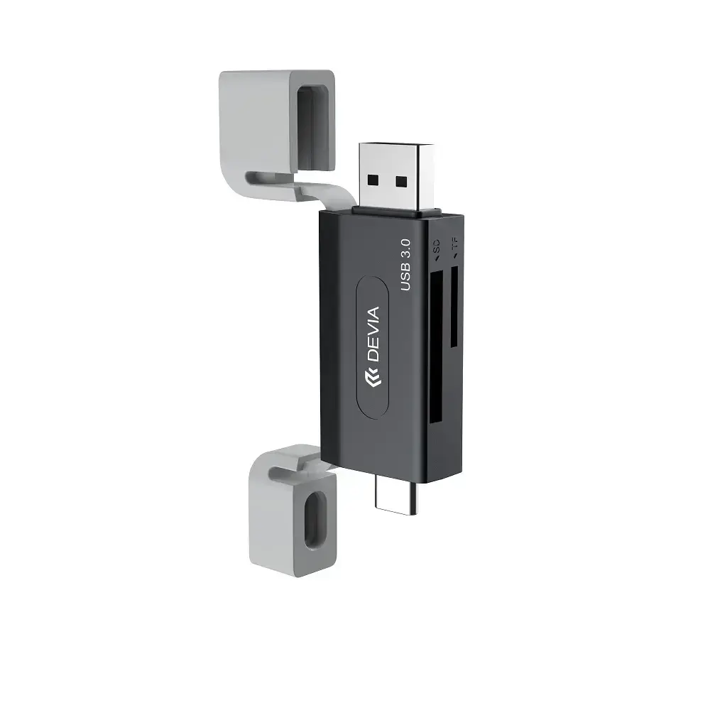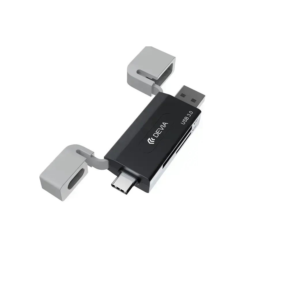 The portable 3.0 card reader from Devi allows for simultaneous reading of two cards through the SD and TF card slots. It features USB-C and USB connectors, and is compatible with phones, laptops, tablets, cameras, and other devices! The theoretical data transfer speed is 5 Gbps. The reader is compact but essential for any office or home. Silicone caps protect the ports from dust and damage in case of a fall.