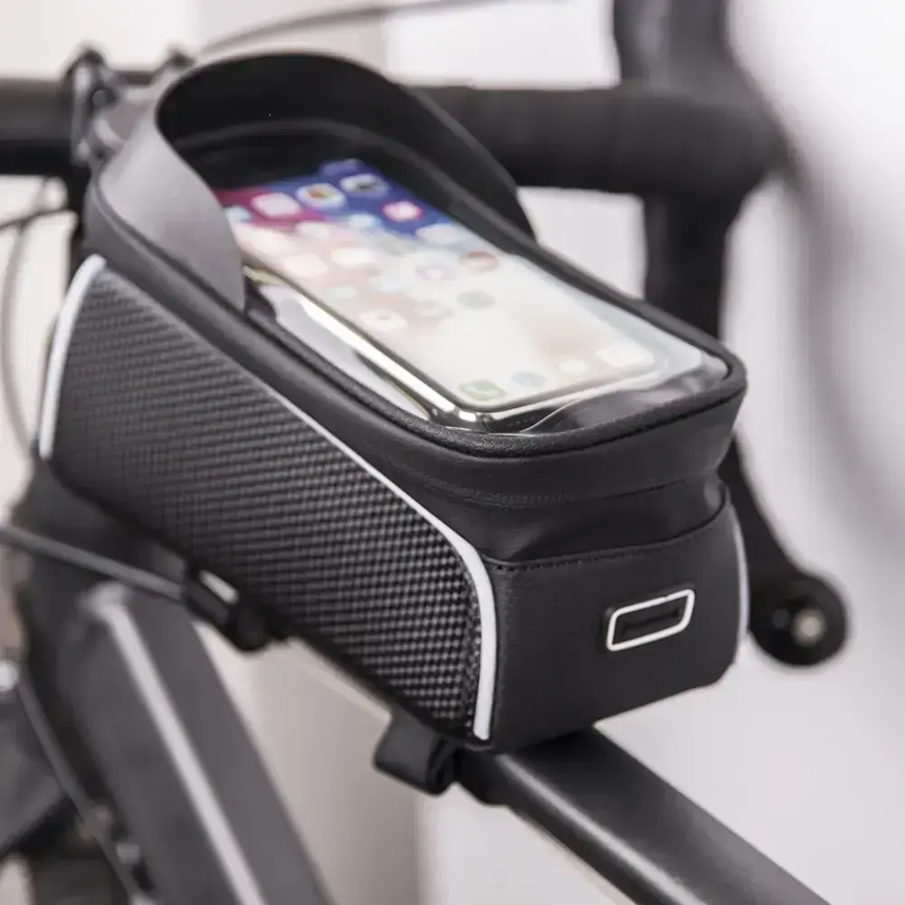 Vadensizturīgā velosipēda soma ļauj ērti lietot tālruni vai GPS, braucot ar velosipēdu, pat lietainā laikā. Somas uzstādīšana ir ātra un vienkārša - nav nepieciešami nekādi instrumenti. Pateicoties pieskārienus vadošajai folijai, jūs varat darbināt skārienekrānu, neizņemot tālruni no somas. Izstrādājumu var piestiprināt ne tikai pie velosipēda stūres, bet arī pie bērnu ratiņiem, skrejriteņa un motocikla vai motorollera stūres, nodrošinot drošību, pateicoties atstarojošiem elementiem. Tālruņa vietas izmērs ir 17,5 x 9 cm, loga izmērs 9 x 16,5 cm.