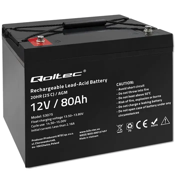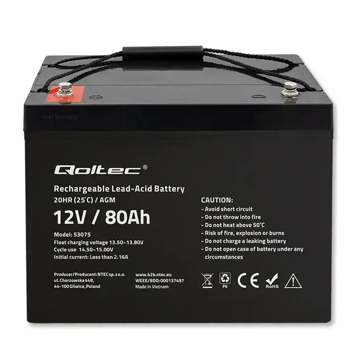 Qoltec AGM battery | 12V | 80Ah | 23.5kg | Maintenance-free | Strong | LongLife | for UPS, RV, boat, heater