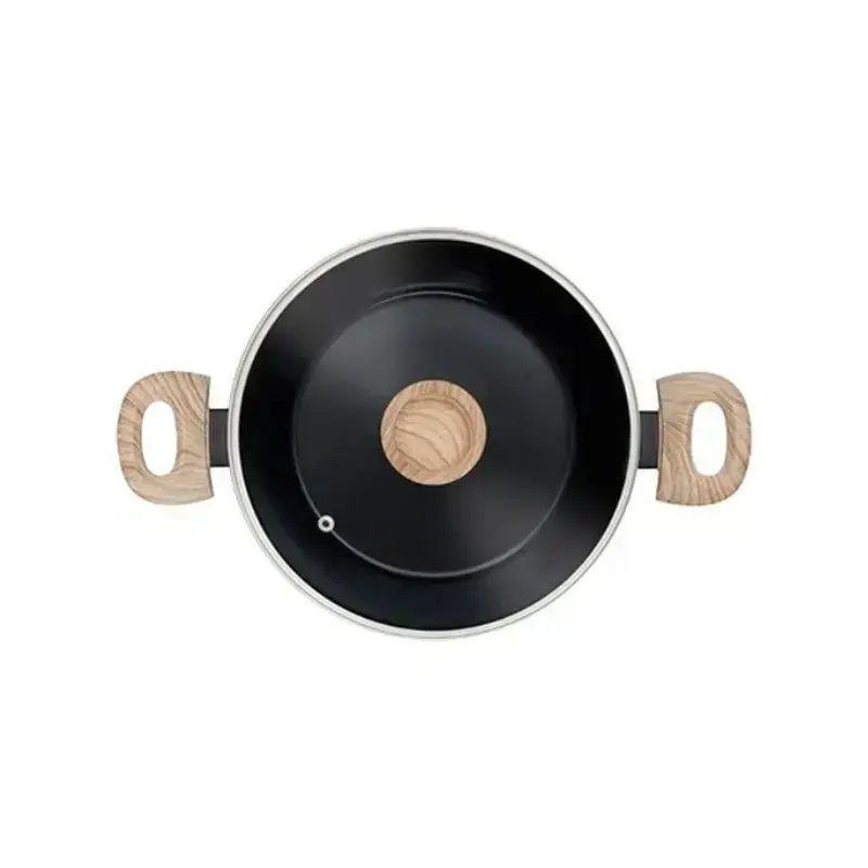 Bakelīta rokturis ar koka efektu. Keramikas non-stick pārklājums veselīgāks gatavošanai, ilgāk kalpo. Der visu veidu plītīm, ieskaitot indukcijas.