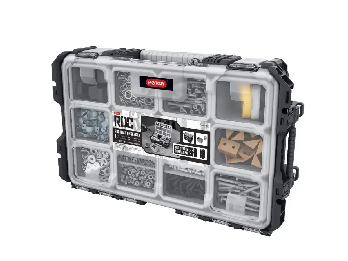 Ideal for professionals, the small organiser offers a convenient solution for storing and transporting various accessories. Equipped with 10 removable and adjustable compartments. The transparent lid allows you to easily see inside the organiser without opening it. Compatible with other KETER Connect products.