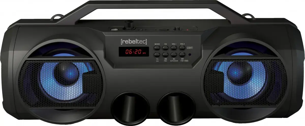 Przenośny głośnik bluetooth z radiem ze sterowanie za pomocą smartphona, pokrętła lub przycisków. Kompatybilny z Bluetooth 5.0, moc 18W RMS, głośnik 102mm , tryby: bluetooth, radio FM, karta microSD , AUX, USB, TWS. Wbudowany akumulator Li-Ion 2000mAh 3,7V (ładowany z micro USB), złącze micro USB (ładowanie akumulatora), pasmo przenoszenia 35Hz-20kHz, wygodny uchwyt do przenoszenia, zawiera odpinany pasek na ramię, gniazdo USB - możliwość odtwarzania muzyki z pendrive. Czas grania 6-9h, a czas ładowania akumulatora wynosi max 3,5h. Rozmiar 440 x 146 x 177mm, masa netto 1670g.