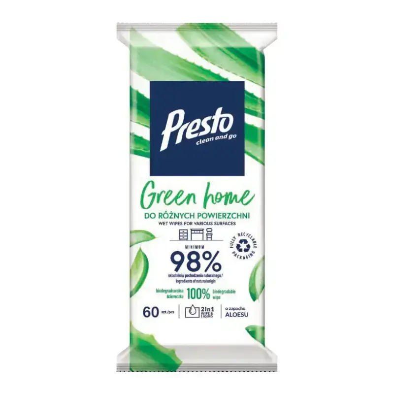 Влажные салфетки Presto Green Home для различных поверхностей с ароматом алоэ вера. Мягко и эффективно удаляет загрязнения с гладких поверхностей: мебели, ламината, терракоты, напольных панелей, керамики, кафеля и пластика. Они оставляют приятный аромат, не раздражают кожу рук. 98% ингредиентов натурального происхождения. 100% биоразлагаемая ткань. Полностью перерабатываемая упаковка.