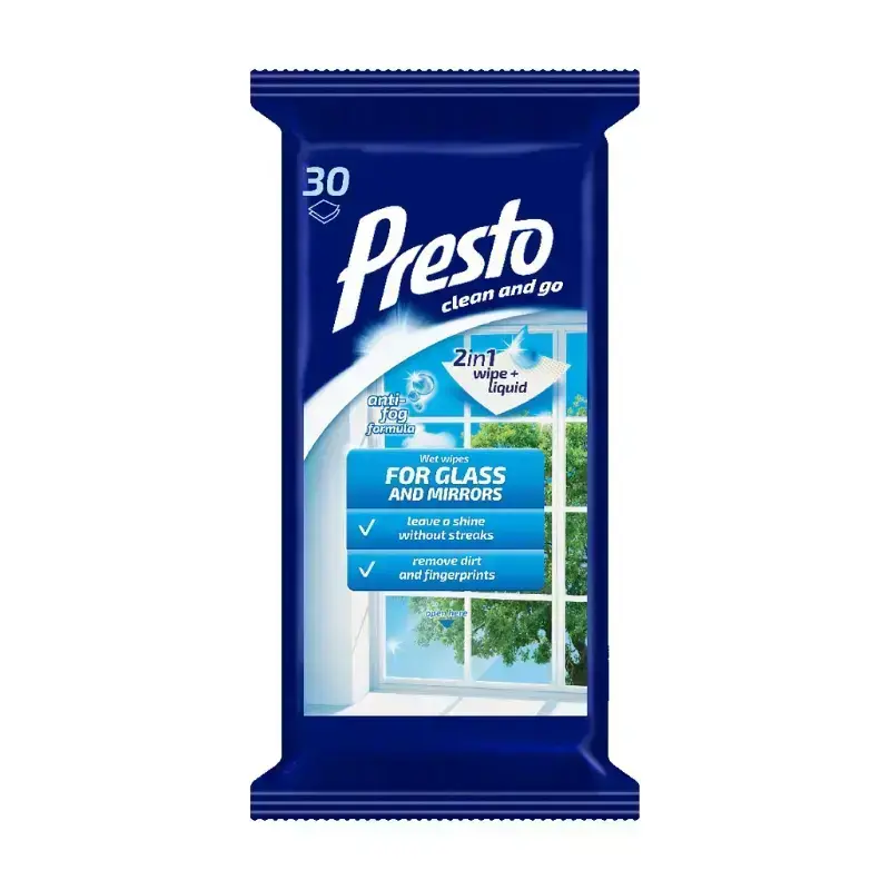 Влажные салфетки Presto для окон и зеркал предназначены для ежедневной очистки стеклянных поверхностей: окон, зеркал, столешниц. Содержит спирт, который делает поверхность блестящей и без разводов. Салфетки предотвращают запотевание благодаря антиперспирантам, а также предотвращают оседание пыли благодаря антистатическим веществам.
