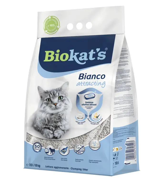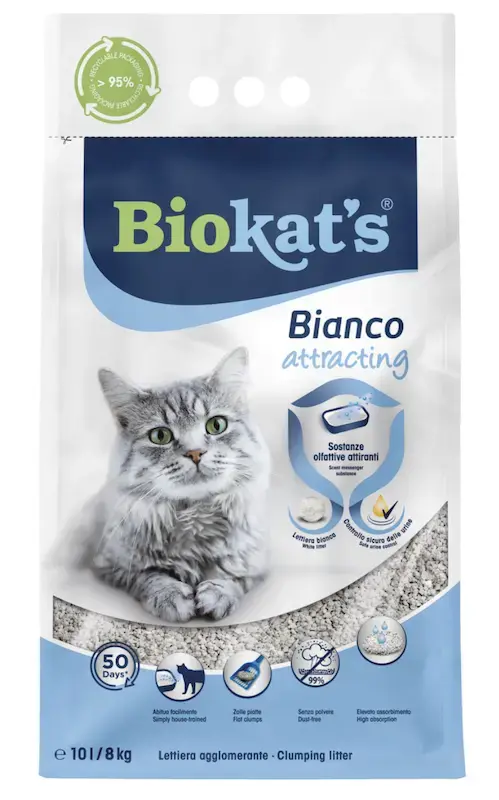 Biokat’s Bianco attracting satur sugas specifisko smaržas feromonu, kas kaķiem ir īpaši pievilcīgs. Šī viela var palīdzēt kaķiem atrast tualeti arī sarežģītās vai stresa situācijās. Tā rada drošības un uzticības sajūtu, kur kaķis jūtas labi. Biokat’s Bianco attracting ir piemērots visiem kaķiem, tostarp kaķēniem, kuriem vēl jāiemācās lietot kaķu tualeti.