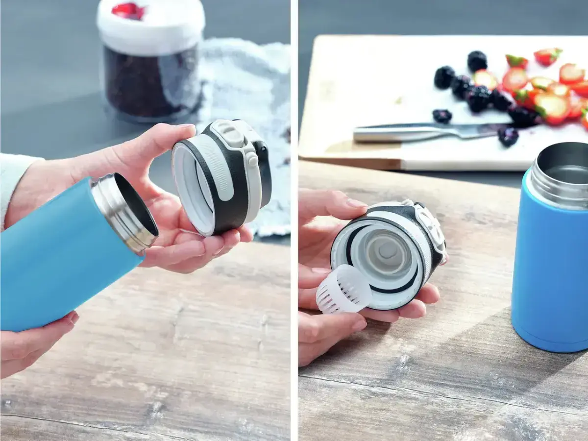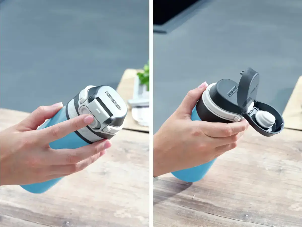Термокружка на 100% герметична и открывается легко и удобно одним движением. Крышка имеет дополнительный запирающий механизм, предотвращающий случайное открытие: это означает, что чашку можно безопасно носить в сумке.
