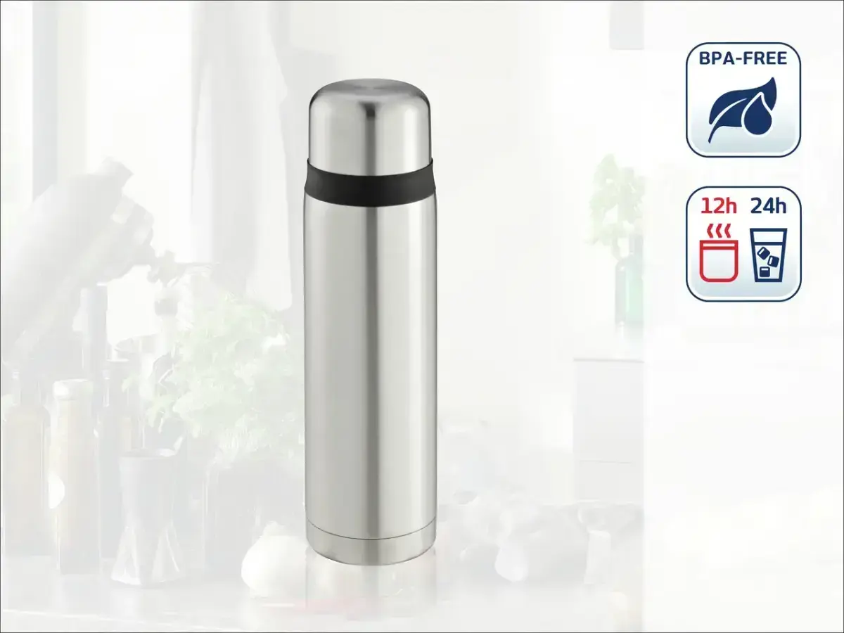 Двойные вакуумные стенки которые изготовлены из стали высокого качество, обеспечивают изоляцию высокого уровня и поддерживает горячие напитки горячими, холодные напитки холодными. Этот ударопрочный и герметичный термос идеально подходит для путешествий. Для того, чтобы пользоваться термосом как можно дольше, то просим Вас соблюдать следующие правила: Перед первым использованием тщательно вымыть термос теплой водой. Не мыть в посудомоечной машине! Для того, чтобы обеспечить лучшую тепло- и холодо изоляцию, термос необходимо прополоскать горячей водой перед наливанием горячего напитка и холодной водой – перед наливанием прохладительного напитка. Никогда не использовать микроволновую печь и духовку, чтобы нагреть термос. Термос нельзя использовать, чтобы поддерживать теплыми молочные продукты или детскую еду. Чистка термоса: Снаружи: протереть влажной тряпкой или помыть жидким моющим средством. Внутри: прополоскать только теплой водой. Остатки можно легко очистить содой или чистящим средством для зубных протезов.