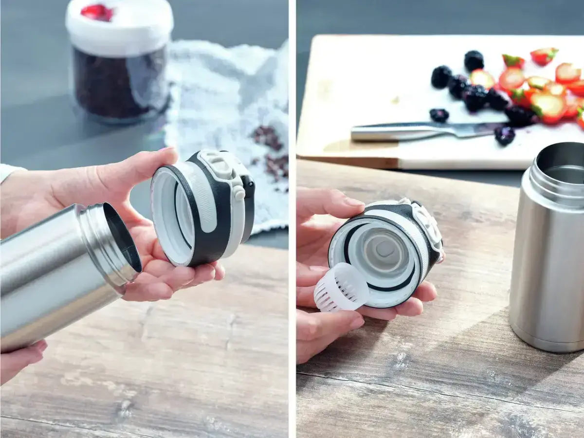 Термокружка на 100% герметична и открывается легко и удобно одним движением. Крышка имеет дополнительный запирающий механизм, предотвращающий случайное открытие: это означает, что чашку можно безопасно носить в сумке.
