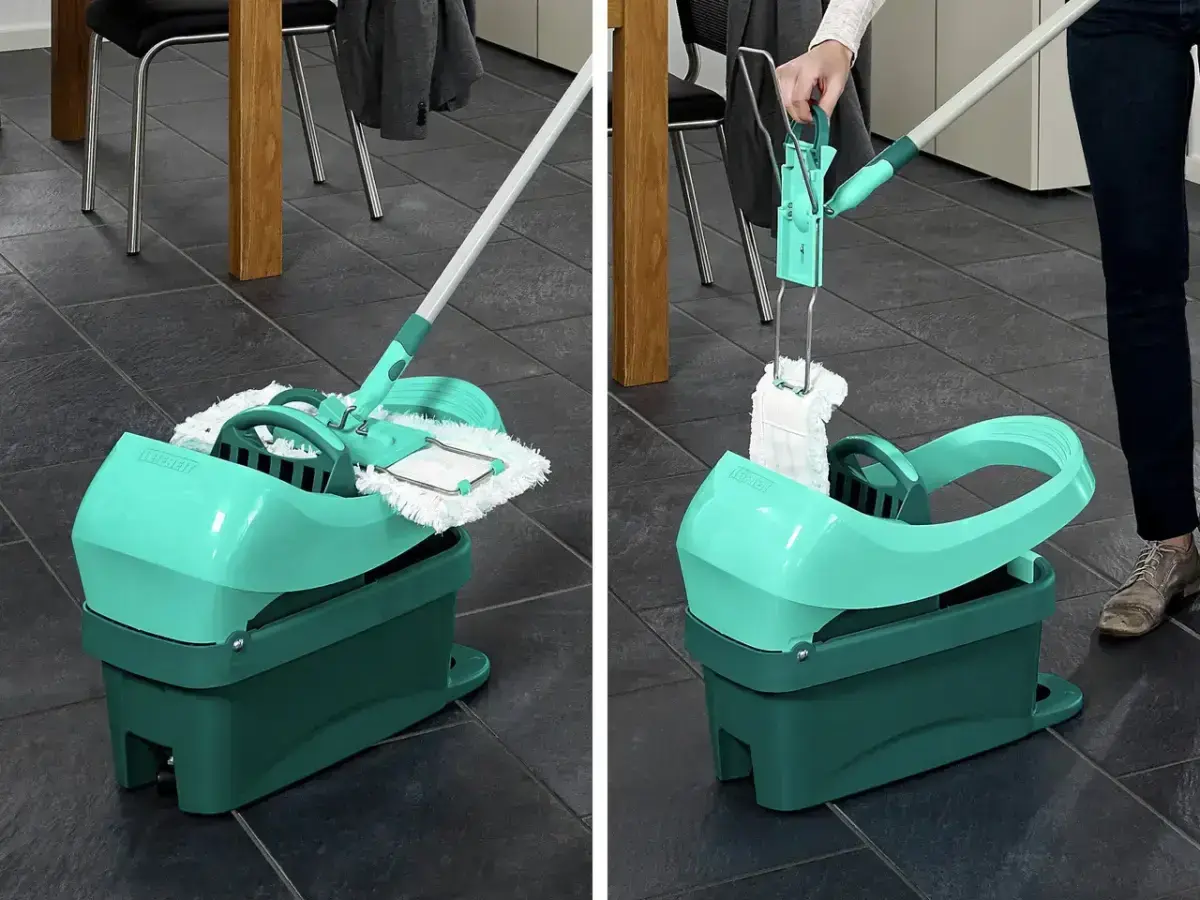 Освободите одну сторону тряпки, нажав на педаль. Тряпка остается прикрепленной к другому концу рамки пластиковыми зажимами. Поместите ткань для пола в пресс, чтобы она сложилась слоями. Также поместите в ведро раму щетки для пола. Нажмите на педаль ногой (2-3 раза), осторожно выдавливая воду из ткани, пока она не станет настолько сухой, насколько вам нужно. Удлиненная ручка щетки из нескользящего материала. Идеально подходит для чистки ступеней лестниц. Два монтажных рычага.